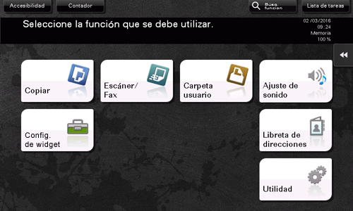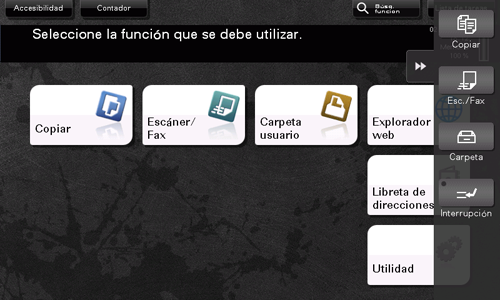 [Fax] | Toque este botón para visualizar la pantalla principal del modo fax. Para utilizar esta función, el kit de fax opcional es necesario. |