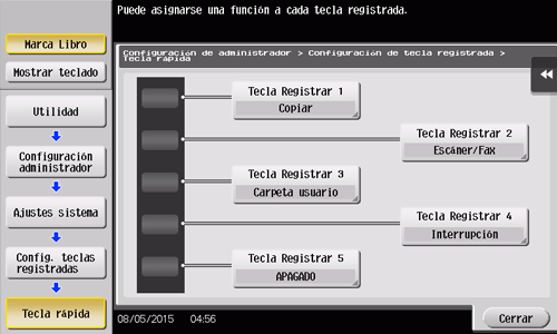 Toque [Utilidad] - [Config de Admin] - [Ajustes sistema] - [Config. teclas registradas] - [Tecla rápida] y, a continuación, toque la tecla a la que desee asignar una función distinta.