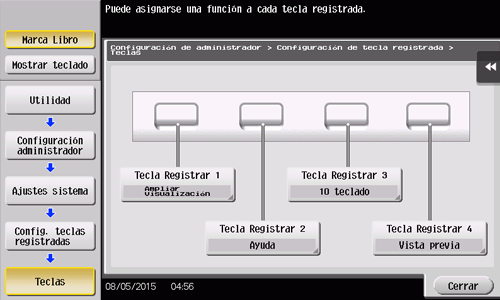 1. Toque [Utilidad] - [Config de Admin] - [Ajustes sistema] - [Config. teclas registradas] - [Tecla fija] y, a continuación, toque la tecla a la que desea asignar una función distinta.