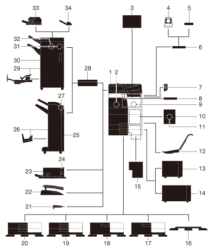33 | Unidad de inserción posterior PI-507 | Instale esta unidad en la Unidad de acabado FS-537/FS-537 SD. Esta unidad permite insertar cubiertas en la las páginas copiadas o impresas. Esta unidad le permite también manejar manualmente la unidad de acabado (solo puede acceder a la bandeja inferior). |