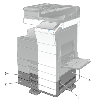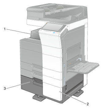 1 | Interruptor de corriente del calentador | Se utiliza para encender o apagar las operaciones del calentador. Esta función evita que el papel se vea afectado por la humedad cuando la máquina está encendida. El calentador está disponible al adquirir una unidad sencilla/doble de alimentación de papel, una bandeja de gran capacidad (integrada), una mesa de trabajo o una unidad de gran capacidad. Para utilizar la unidad de gran capacidad, es necesario adquirir el kit de transformador TK-101 por separado. |