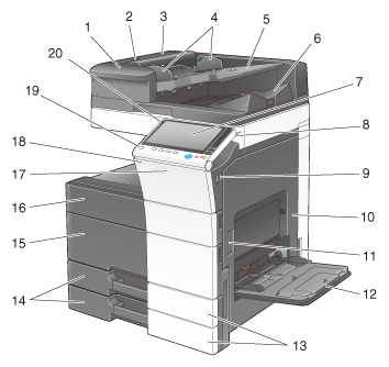 1 | Alimentador de documentos de escáner dual | Introduce de forma automática y escanea los originales por páginas. Esta unidad escanea un original de 2 caras y solo requiere que el papel se introduzca en la máquina una vez sin invertirlo. Esta unidad se denomina ADF en el manual. |