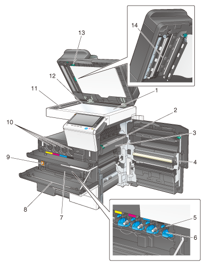 14 | Cristal hendido del escáner (posterior) | Se utiliza para escanear el lado posterior de un original cuando se usa el ADF. |