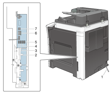 2 | Puerto USB (tipo A) USB 2.0/1.1 | Se utiliza para conectar el cable del kit de fax (línea 1). |