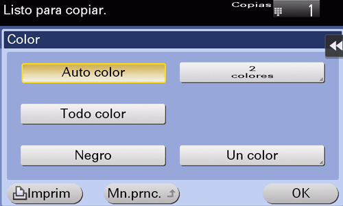 Hay cinco modos de color disponibles: [Color automático] para realizar la copia basada en el color del original, [Todo color], [2 colores], [Un color] y [Negro].