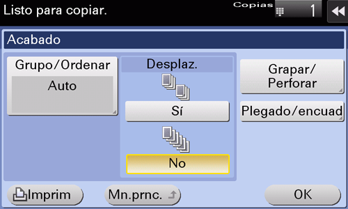 [Desplaz.] | Seleccione [Sí] al clasificar por copias o por páginas para expulsar el papel. Si se ha instalado una unidad de acabado o el separador de trabajos JS-506, las copias se expulsan y apilan una encima de otra, con cada juego de copias o páginas escalonado para separarlas. Si no se ha instalado una unidad de acabado o el separador de trabajos JS-506, las copias impresas se expulsan y clasifican según un patrón cruzado alternativo cuando se cumplen las siguientes condiciones.