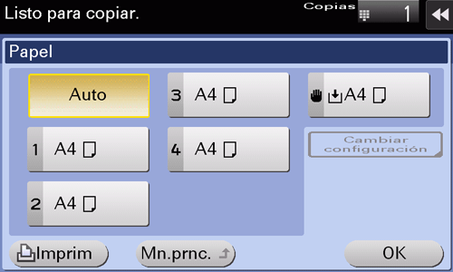 [Automática] | Toque este botón para seleccionar automáticamente el papel según el tamaño del original detectado al realizar una copia. |