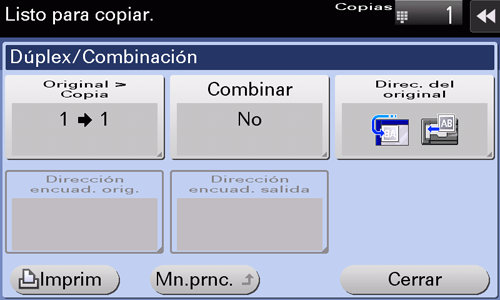 [Original > Copia] | Seleccione una combinación del original que va a cargarse (original de 1 cara u original de 2 caras) y el método de copia (copia de 1 cara o copia de 2 caras). Para escanear un original de 2 caras, indique si está encuadernado en la parte superior, izquierda o derecha en [Dirección encuad. orig.] Para realizar una copia en las 2 caras de las hojas de papel, especifique la encuadernación en la parte superior, izquierda o derecha en [Dirección encuad. salida]. |