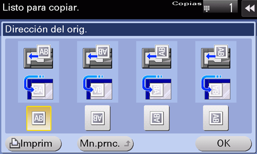 Toque [Original/Densidad] - [Dirección del original] y seleccione la dirección de carga del original.