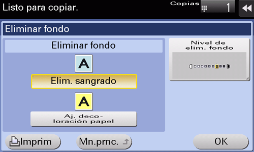 [Eliminación de fondo] | Toque este botón para copiar un original fino de 2 caras o un original con el fondo en color, al nivel óptimo de calidad de imagen.