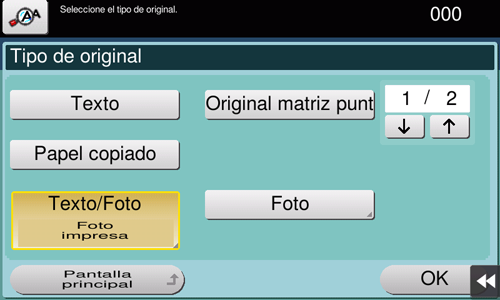 [Original de matriz punt] | Toque este botón para escanear un original, que contenga principalmente texto en caracteres finos o poco visibles, al nivel óptimo de calidad de imagen. Esta función reproduce texto utilizando una densidad de píxeles elevada, lo que da lugar a textos fáciles de leer. |