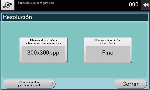 [Resolución escáner.] | Seleccione la resolución del original para la transmisión de escaneado. Para utilizar Transmisión de correo electrónico, Transmisión SMB, Transmisión FTP, Transmisión WebDAV o Guardar en carpeta de usuario, se selecciona la siguiente resolución para escanear el original.