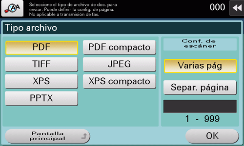 Los tipos de archivo disponibles son PDF, TIFF, JPEG, XPS, PPTX, DOCX, XLSX y otros tipos. Para almacenar datos importantes del original debe utilizarse el formato de archivo PDF cifrado con contraseña.
