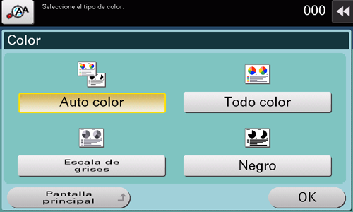 [Color automático] | Al escanear un original seleccione esta opción para determinar automáticamente [Todo color] o [Escala de grises] de acuerdo con el color de dicho original. |