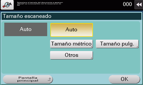 Hay varios tamaños de escaneado, por ejemplo, [Auto] que se ajusta al tamaño del original, [Tamaño pulg.] y [Tamaño métrico].