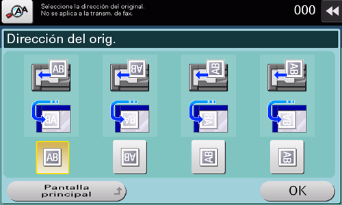 Toque [Config. escaneado] - [Configuración del original] - [Dirección del original] para seleccionar la dirección de carga del original.