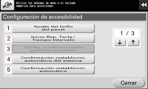 [Accesibilidad] está disponible al configurar el entorno operativo del panel de control, por ejemplo, al ajustar el panel táctil o al cambiar los sonidos de las teclas.