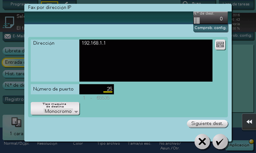 • Ejemplo de entrada de dirección IP (IPv4: "faxporip@[192.168.1.1]"