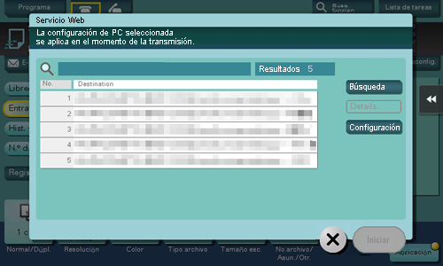 Si resulta difícil encontrar un destino porque hay demasiados destinos, toque [Búsqueda]. Seleccione un destino y toque [Detalles] para comprobar la información de destino. Para seleccionar una configuración de opciones, toque [Configuración].