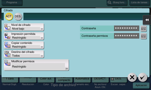 Si el [Nivel de cifrado] se ha ajustado [Nivel alto 1] o [Nivel alto 2], pueden seleccionarse con mayor detalle los contenidos permitidos.