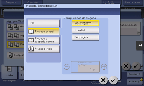 Se obtiene una hoja copiada plegada en dos. Seleccione también la Unidad mediante la cual se pliega el papel en [Por Trabajo copia (Varias hojas)], [1 unidad] y [Por página]. Al configurar [Por página], especifique el número de páginas que deben plegarse al mismo tiempo.