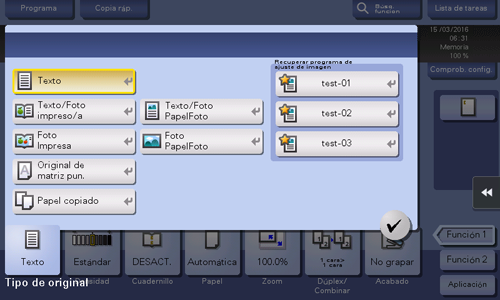 [Recuperar programa de ajuste de imagen] | Llame el programa de ajuste de la calidad de imagen. Se aplica el contenido registrado de un programa. Para un programa de ajuste de imagen, puede registrar la configuración de [Tipo original], [Densidad], [Eliminación de fondo], [Mejora del texto], [Invertir neg./pos.], [Color de fondo], [Ajuste de colores], and [Imagen reflejada]. Para obtener más información sobre cómo se registra, consulte Aquí. |