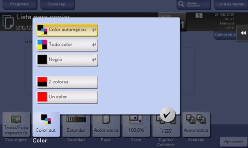 [Color automático] | Al copiar, la máquina selecciona, automáticamente, [Todo color] o [Negro], según el color del original escaneado. |