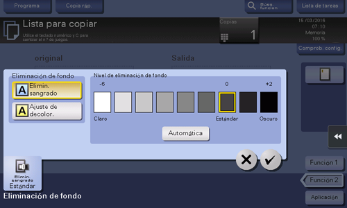 [Nivel de eliminación de fondo] | Toque este botón para ajustar la densidad del color de fondo para un original con un fondo en color. Si se selecciona la opción [Automática], la densidad del color de fondo se determina de forma automática y el original se copia con una densidad del fondo óptima. |