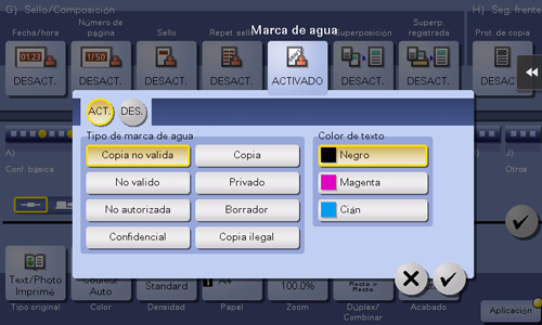 [ACT.]/[DES.] | Seleccione [ACT.] para imprimir una marca de agua. |