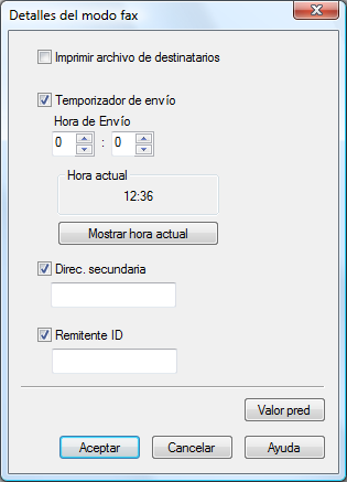 [Cargar información de configuración] | Introduzca la información que ha configurado en los campos [Empresa], [Departamento], [Nombre] y [Nº de fax] (utilizando 80 caracteres como máximo para cada entrada). Puede seleccionar esta opción si se ha añadido un destinatario a la [Lista de destinatarios] de la pantalla [Ventana emergente transmisión fax].