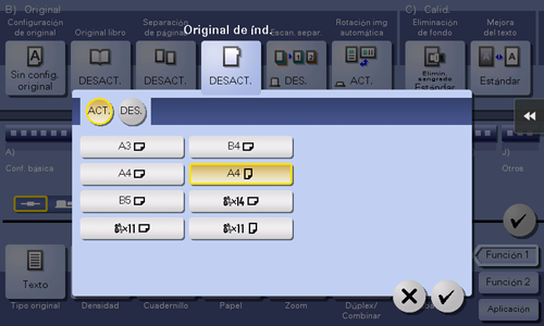 [ACT.]/[DES.] | Seleccione [ACT.] para copiar un original con índice. Seleccione también el tamaño del original con índice. |