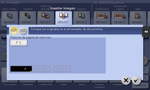 [Posición de página de inserción] | Indique el número de página en el que desea insertar una hoja. El original se inserta después de la página especificada.