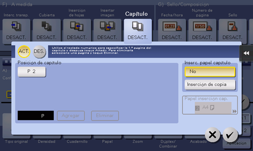 [ACT.]/[DES.] | Seleccione [Act.] para especificar la opción Inserción de hojas. |