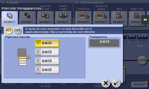 [Papel para intercalar] | Seleccione la bandeja para el papel que se va a insertar entre las transparencias. El tamaño de las transparencias cargadas en la Bandeja manual se muestra en [Transparencia]. Asegúrese de utilizar el mismo papel para transparencias cargadas y para el papel que se va a insertar. |