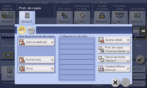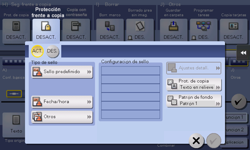 [Tipo de protección de copia] | Seleccione un sello utilizado. También pueden imprimirse la fecha y hora.