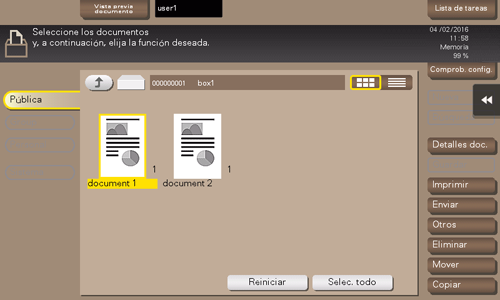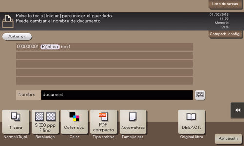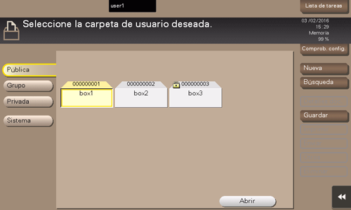 En este ejemplo, se utiliza la carpeta de usuario pública para fines explicativos. Para utilizar una carpeta de usuario personal o una carpeta de usuario de grupo, toque [Privada] o [Grupo] y seleccione la carpeta deseada.