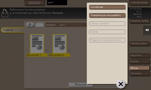 [Tran. encuad] | Esta opción se muestra al seleccionarse varios archivos. Es posible combinar varios archivos en un único archivo y enviarlos al mismo tiempo. Si se seleccionan varios archivos y se especifica [Des.], no pueden utilizarse las opciones [Tipo de archivo] y [Configuración de aplicaciones]. |