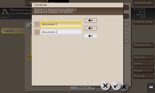 [Combinar] | Esta opción se muestra al seleccionarse varios archivos. Es posible combinar varios archivos en un único archivo e imprimirlos al mismo tiempo. Si se seleccionan varios archivos y se especifica [Desact], no pueden utilizarse las opciones [Config básica] y [Configuración de aplicaciones]. |