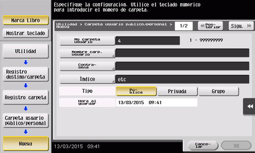 Toque [Utilidad] - [Registro destino/carpeta] - [Registro carpeta] - [Carpeta usuario público/personal] - [Nueva].