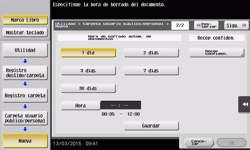 Si no se utilizan los archivos almacenados en una carpeta de usuario, se eliminan automáticamente cuando haya pasado la [Hora de borrado autom. de documentos] (valor predeterminado: [1 día]).