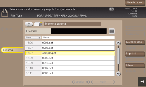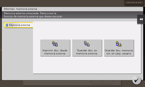 También es posible imprimir archivos seleccionando el modo Carpeta de usuario. Para ello, toque [Sistema] - [Memoria externa].