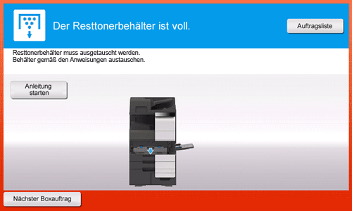 Wenn der Resttonerbehälter voll ist, werden Sie anhand einer Meldung zum Austauschen des Behälters aufgefordert (bei Ersetzung durch den Benutzer). Tippen Sie auf [Anleitung starten] und folgen Sie dann den Anweisungen.