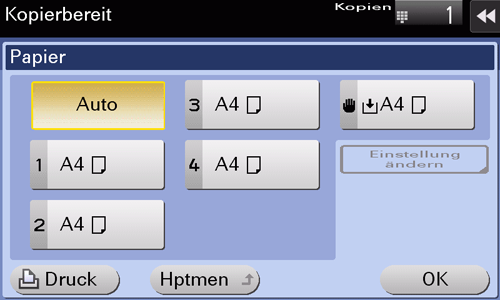 [Auto] | Wählt beim Kopieren automatisch Papier passend zum Originalformat aus. |
