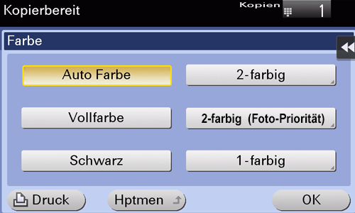 [Auto-Farbe] | Wählt beim Kopieren in Abhängigkeit von der Farbe des gescannten Originals automatisch [Vollfarbe] oder [Schwarz]. |