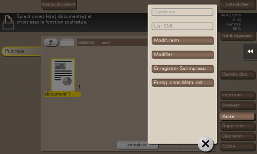 Pour imprimer, appuyez sur [Autre] et ensuite sur [Combiner]. Pour envoyer, appuyez sur [Autre] et ensuite sur [Lier ÉMI].