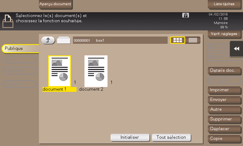 Appuyez sur [Boîte utilisateur] sur l'écran d'accueil, sélectionnez la boîte utilisateur concernée et appuyez sur [Ouvrir].