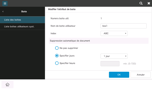 Appuyez sur [Boîte utilisateur] sur l'écran d'accueil, sélectionnez la boîte utilisateur concernée et appuyez sur [Enregistrer].