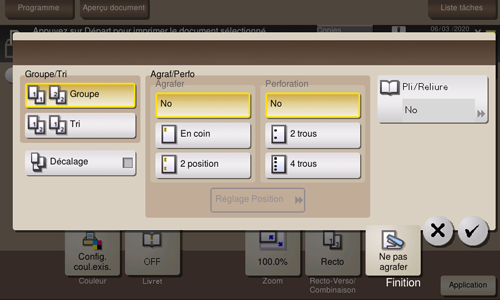 Appuyez sur [Finition] et configurez les différents éléments pour la finition.