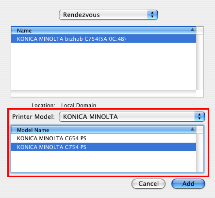 Fügen Sie den Drucker, der automatisch durch Rendezvous erkannt wurde, zum Computer hinzu.