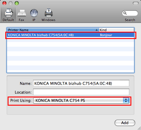 Fügen Sie den Drucker, der automatisch durch Bonjour erkannt wurde, zum Computer hinzu.